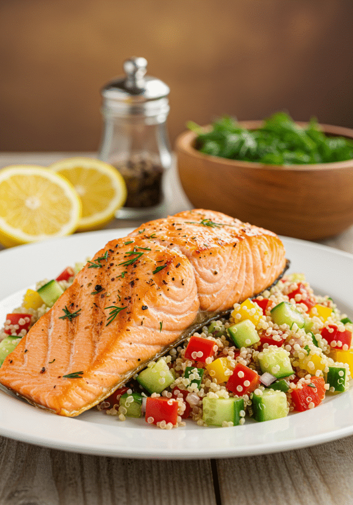 - Grilled Salmon with Quinoa Salad: Packed with omega-3s, protein, and fiber, this dish is perfect for a clean yet satisfying meal.