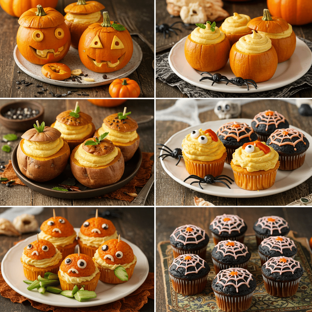 A three course Halloween meal might start with pumpkin soup, continue with a spooky main like stuffed peppers carved as jack o’ lanterns, and finish with a dessert such as ghost brownies or spiderweb cupcakes. It’s a fun way to bring Halloween food to the dinner table in a creative format.